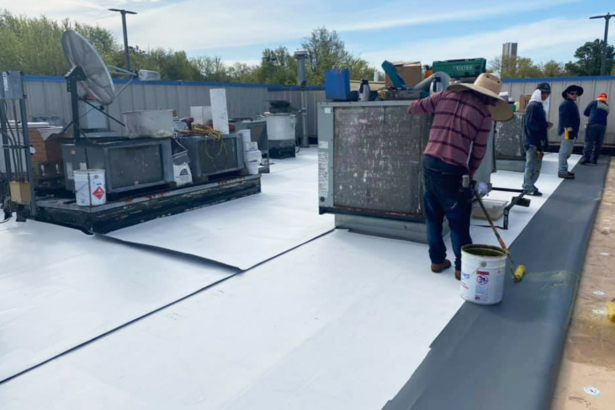 Process of installing a complete roof system on a new building, beginning with the structural frame, followed by the roof deck, then layers of underlayment, flashing, and finally the primary roofing material like shingles or tiles.